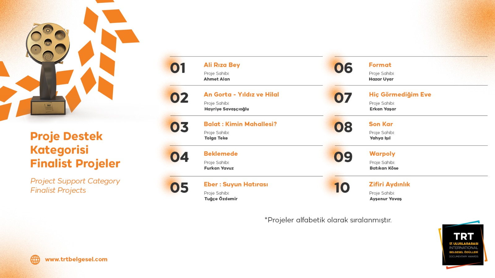 TRT tarafından; amatör ve profesyonel belgesel filmcileri desteklemek, belgesel türünün gelişmesi ve yaygınlaşmasına katkıda bulunmak ve çeşitli ülkelerden belgesel filmlerin seyirciyle buluşmasını sağlamak amacıyla düzenlenen 17. TRT Uluslararası Belgesel Ödülleri’nin finalistleri açıklandı. Ön eleme kurulunun titiz çalışmaları neticesinde belirlenen 40 finalist, www.trtbelgesel.com adresinde yayınlandı.