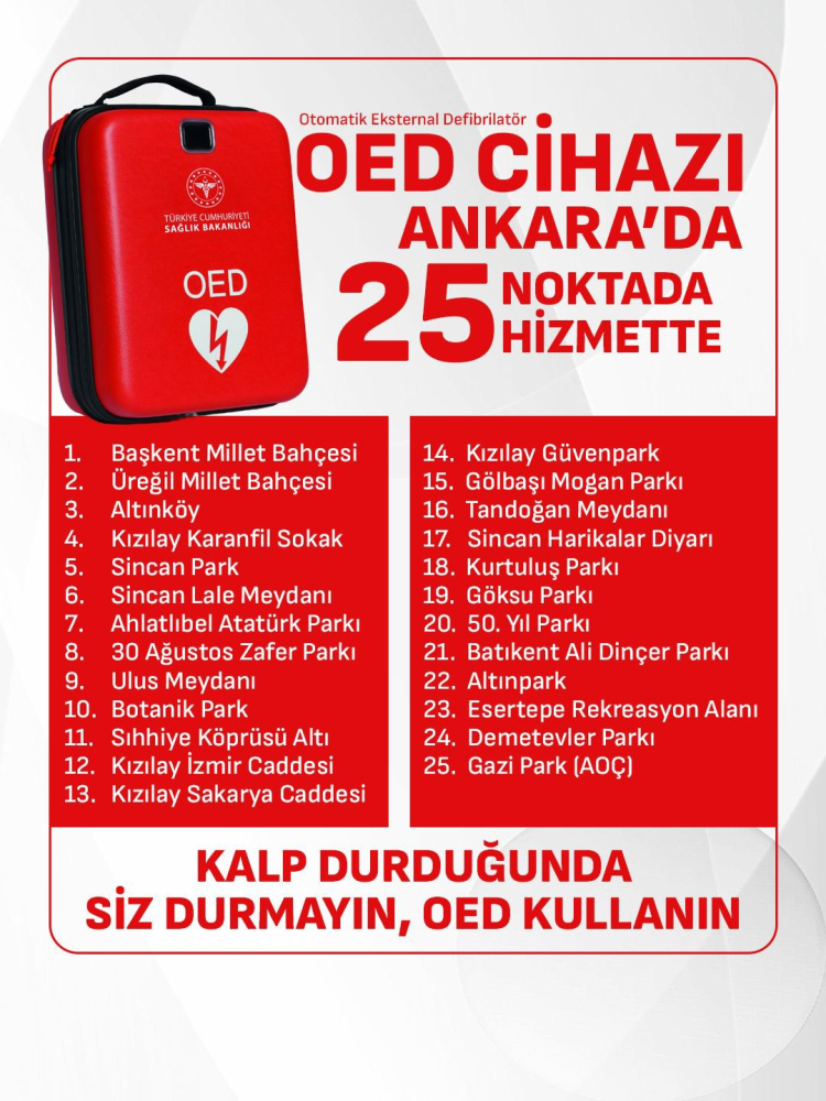 Sağlık Bakanlığı ve ASELSAN iş birliğiyle geliştirilen yerli Otomatik Şok Cihazları (OED), Ankara’da 25 noktaya yerleştirildi. Cihazlar, kalp krizi riskine karşı ambulans gelene kadar yaşam desteği sağlıyor.