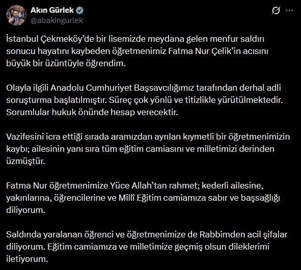 Adalet Bakanı Akın Gürlek, İstanbul’un Çekmeköy ilçesinde bir lisede meydana gelen saldırı sonucu hayatını kaybeden öğretmen Fatma Nur Çelik’in acısını büyük bir üzüntüyle öğrendiğini belirterek şu ifadelere yer verdi;