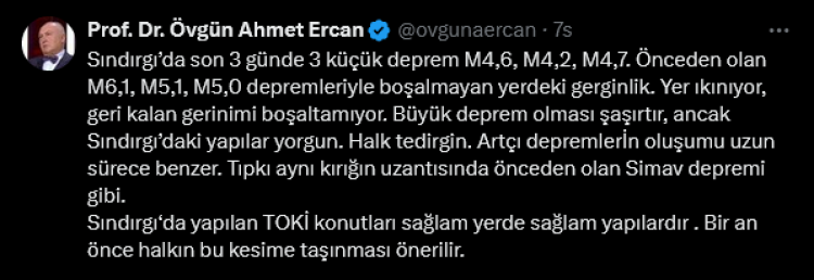 Prof. Dr. Övgün Ahmet Ercan, Balıkesir Sındırgı’da son 3 günde M4,6, M4,2 ve M4,7 büyüklüğündeki depremlerin, önceki M6,1, M5,1 ve M5,0 sarsıntılarıyla boşalmayan gerginliği gösterdiğini belirtti. “Büyük deprem şaşırtır ama yapılar yorgun, halk tedirgin. Artçılar uzun sürecek,” diyerek TOKİ konutlarına taşınmayı önerdi.