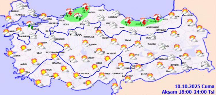 Meteoroloji Genel Müdürlüğü tarafından yapılan tahminlere göre, yurdun genelinin parçalı yer yer çok bulutlu, Batı Karadeniz(Bolu hariç), Orta ve Doğu kıyıları ile Sakarya’nın kıyı kesimleri, Artvin ve Ardahan çevrelerinin sağanak ve yer yer gök gürültülü sağanak yağışlı geçeceği tahmin ediliyor. Yağışların, Düzce’nin kıyı kesimleri ile Zonguldak ve Bartın çevrelerinde yerel kuvvetli olması bekleniyor.