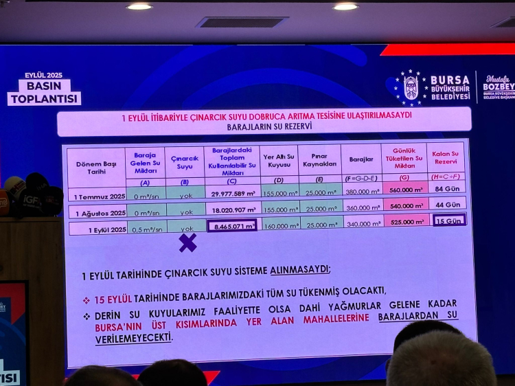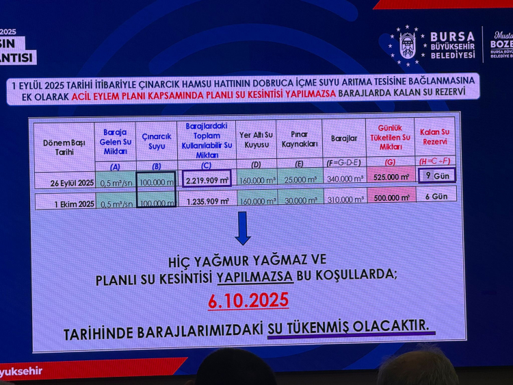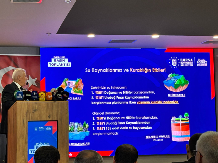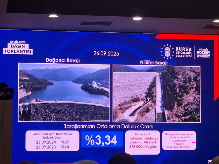 Kuraklık krizine dikkati çeken Bursa Büyükşehir Belediye Başkanı Mustafa Bozbey, Bursa’nın su kaynaklarındaki alarm durumunu ve küresel iklim krizinin kent üzerindeki etkilerini çarpıcı verilerle gözler önüne serdi. Doğancı Barajı’nda doluluk yüzde 6,81, Nilüfer Barajı’nda sıfır olduğunu belirten Bozbey, suyun yüzde 35’inin 250 metre derinlikteki yeraltı kuyularından temin edildiğini söyledi.
