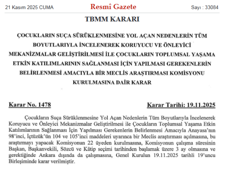 Resmi Gazete’de yayımlanan TBMM kararıyla, çocukların suça sürüklenmesine yol açan nedenlerin incelenmesi ve koruyucu mekanizmaların geliştirilmesi amacıyla 22 üyeli bir Meclis Araştırma Komisyonu kuruldu. Komisyonun çalışma süresi 3 ay, TÜİK verilerine göre 2024’te 202 bin çocuk suça sürüklenmişti.