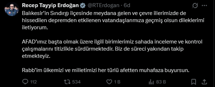 Balıkesir’in Sındırgı ilçesinde meydana gelen ve çevre illerde de hissedilen deprem sonrası Cumhurbaşkanı Recep Tayyip Erdoğan, sosyal medya hesabından bir açıklama yaptı.