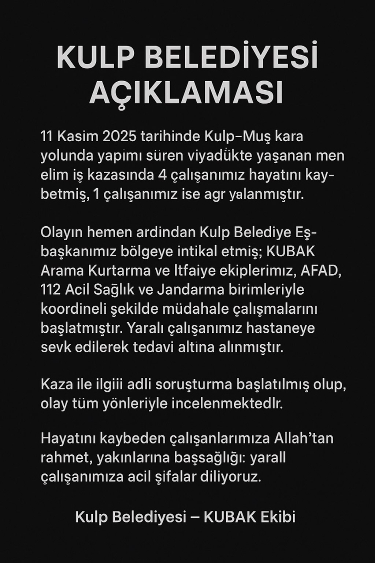 Kulp Belediyesi, “Hayatını kaybeden çalışanlara Allah’tan rahmet, yakınlarına başsağlığı; yaralı çalışanlara acil şifalar diliyoruz” ifadelerini kullandı.