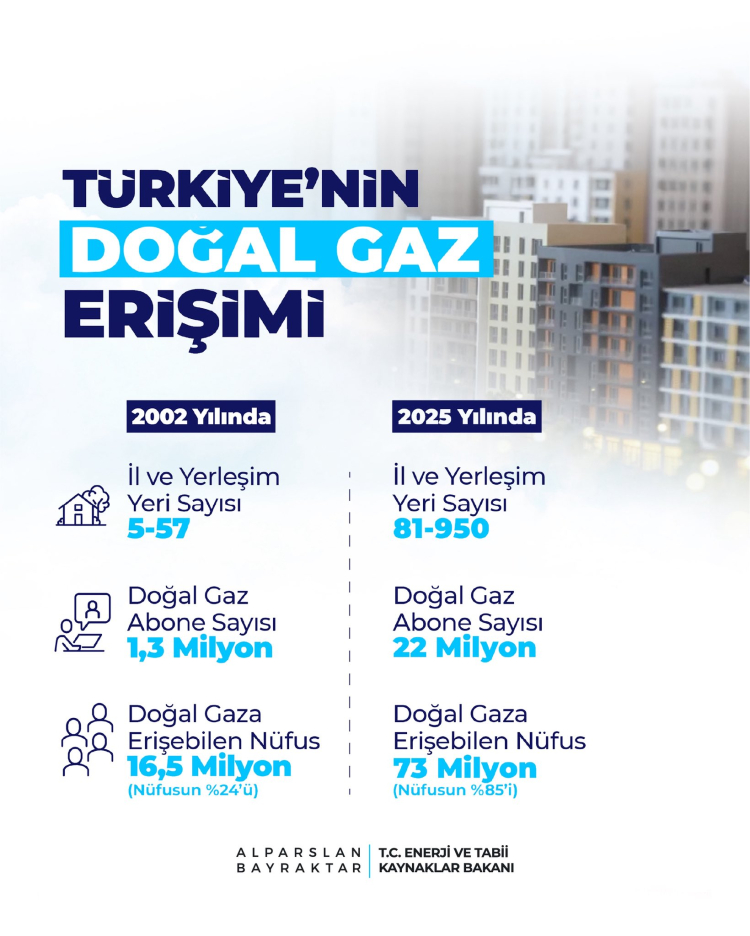 2002 yılında sadece 5 il ve 57 yerleşim yerinde olan doğal gazı, bugün 81 ilin tamamına, 950 yerleşim yerine ve 22 milyon aboneye ulaştırdıklarını vurgulayan Bakan Bayraktar, son bir yılda 51 yerleşim yerine gaz arzı sağlandığını ve konut abonesi sayısının yaklaşık 1 milyon arttığını belirtti.
