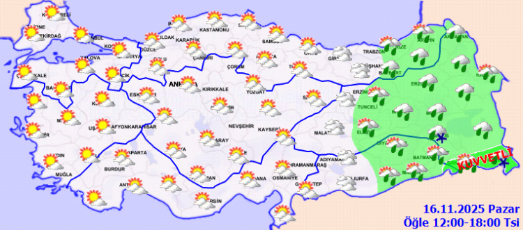 Yağışların, genellikle yağmur ve sağanak, Doğu Karadeniz’in iç kesimlerinin yüksekleri ile Doğu Anadolu’nun kuzey ve doğusunun yükseklerinde karla karışık yağmur ve yer yer kar şeklinde olması bekleniyor.