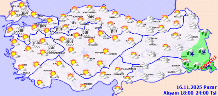 Yağışların, Bitlis, Muş, Siirt, Şırnak ve Hakkari çevreleri ile Van’ın güneybatı kesimlerinde yer yer kuvvetli olacağı tahmin ediliyor. Sabah ve gece saatlerinde Marmara, İç Ege, Batı Akdeniz’in iç kesimleri, İç Anadolu’nun kuzeybatısı ile Batı ve Orta Karadeniz’in iç kesimlerinde yer yer pus ve sis bekleniyor.