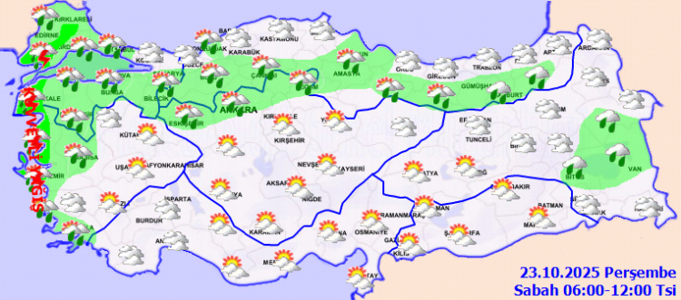 Marmara, Ege, Batı Akdeniz, Doğu Akdeniz’in Toroslar kesimi, Batı ve Orta Karadeniz, Doğu Karadeniz’in iç kesimleri, Doğu Anadolu’nun kuzey ve batısı ile Eskişehir, Ankara, Çankırı, Sivas, Çorum, Bitlis ve Van çevrelerinde yağmur ve sağanak yağış bekleniyor.