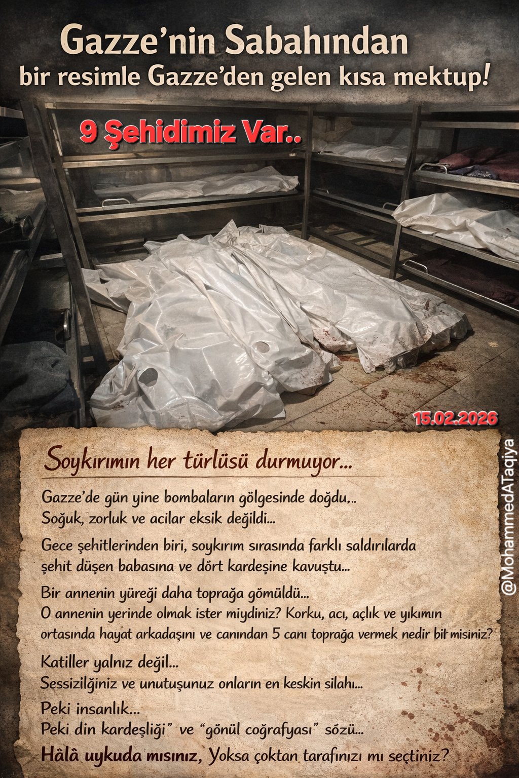 “Soykırımın her türlüsü durmuyor… Gazze’de gün yine bombaların gölgesinde doğdu.. Soğuk, zorluk ve acılar eksik değildi… Gece şehitlerinden biri, o saldırılar sırasında farklı zamanlarda şehit düşen babasına ve dört kardeşine kavuştu… Bir annenin yüreği daha toprağa gömüldü… O annenin yerinde olmak ister miydiniz? Korku, acı, açlık ve yıkımın ortasında hayat arkadaşını ve canından 5 canı toprağa vermek ne demek bilir misiniz? Katiller yalnız kalmıyor… Sessizliğiniz ve unutuşunuz onların en keskin silahı… Peki insanlık nerede… Peki din kardeşliği nerede… Peki “coğrafya kaderdir” ve “gönül coğrafyası” sözü nerede… Garantörlük nerede.. Hâlâ uykuda mısınız, yoksa çoktan tarafınızı mı seçtiniz?..”