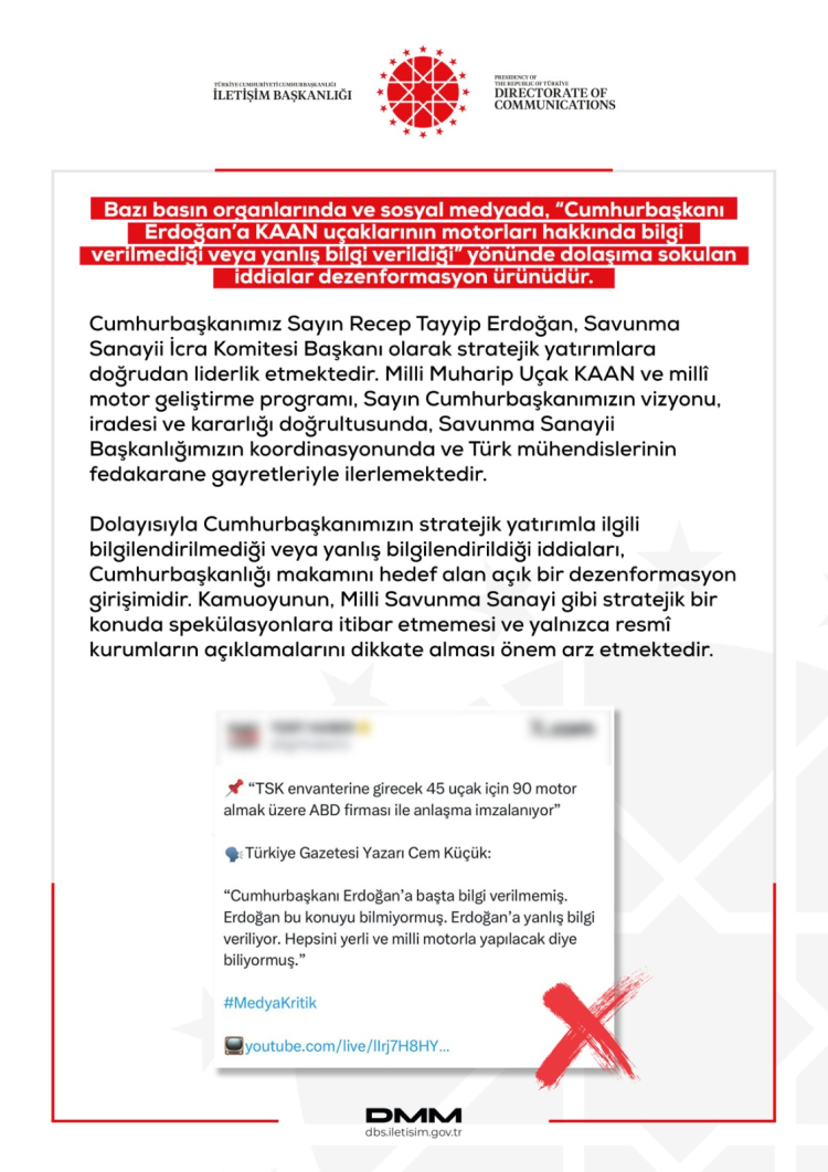 İletişim Başkanlığı, Cumhurbaşkanı Erdoğan’a KAAN uçaklarının motorları hakkında yanlış bilgi verildiği iddialarını yalanladı. Yapılan açıklamada “Cumhurbaşkanımız, Savunma Sanayii İcra Komitesi Başkanı olarak KAAN projesine liderlik ediyor. İddialar dezenformasyon ürünüdür” ifadeleri yer aldı.