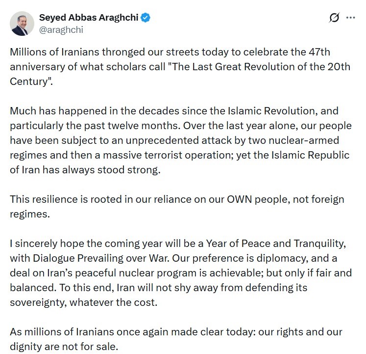 İran Dışişleri Bakanı Abbas Arakçi, İslam Devrimi’nin 47’nci yıldönümü ile ilgili açıklamalarda bulundu. Sosyal medya hesabından yayınladığı mesajda Arakçi; Milyonlarca İranlının, uzmanların “20. yüzyılın son büyük devrimi” olarak adlandırdığı İran İslam Devrimi’nin 47’nci yıldönümünü kutlamak için sokaklara döküldüğünü belirti.