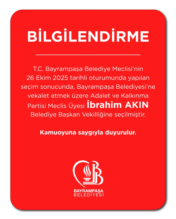 İstanbul Bayrampaşa’da mevcut belediye başkanı Hasan Mutlu’nun görevden uzaklaştırılması ardından yapılan Belediye Başkan Vekilliğine, Cumhur İttifakı adayı AK Partili İbrahim Akın seçildi. Dördüncü tur sonunda AK Partili Akın 19 oyla başkan vekili seçilirken, CHP adayı Recep Öztürk ise 18 oy aldı.
