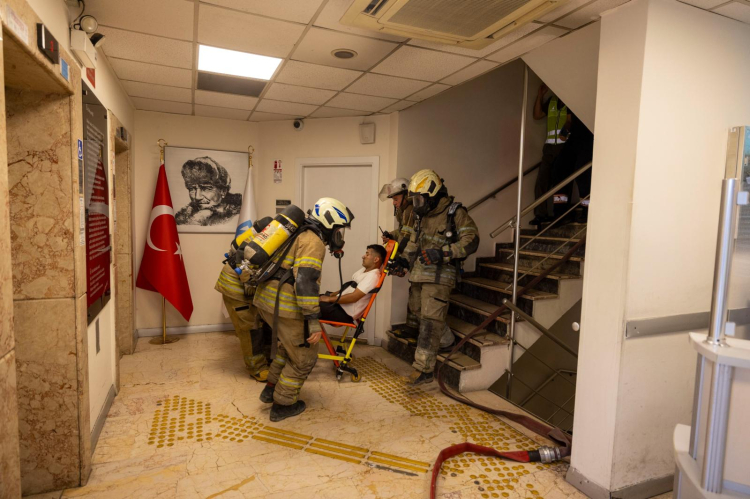 Senaryo gereği binanın çeşitli katlarında biri engelli olmak üzere toplam dört kişi mahsur kaldı. Olay yerine hızla müdahale eden İzmir İtfaiyesi ekipleri, yangını başarıyla söndürürken, binada mahsur kalanları bulundukları yerden kurtardı. Binanın birinci katında bulunan biri engelli olmak üzere iki kişi acil durum taşıma teknikleri kullanılarak bulunduğu yerden kurtarılırken, 22 metrelik merdivenli araç kullanılarak ikinci kat terasında mahsur kalan kazazede sepet sedye ile indirildi. Kurtarma ekibi, dördüncü kattaki kazazedeyi kurtarma sedyesi ile ip iniş tekniğini kullanarak tahliye etti.