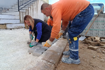 Kadın Başkan kaldırım taşlarını döşedi