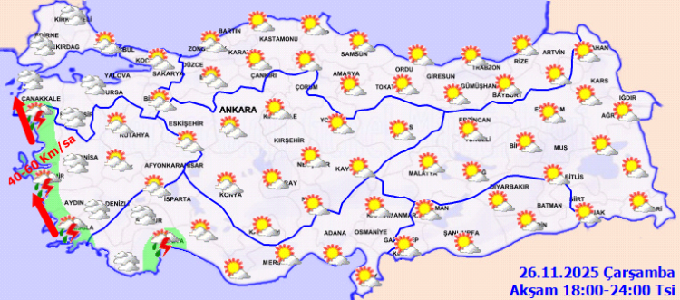 ANKARA (İGFA) – Meteoroloji Genel Müdürlüğü, 26 Kasım Çarşamba gününe ilişkin hava tahmin raporunu yayımladı.