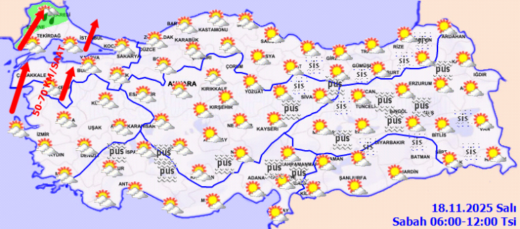 Gece ve sabah saatlerinde Akdeniz’in iç kesimleri, İç Anadolu’nun güney ve doğusu, Orta ve Doğu Karadeniz’in iç kesimleri ile Doğu ve Güneydoğu Anadolu’nun kuzey kesimlerinde pus ve yer yer sis görülebilecek.