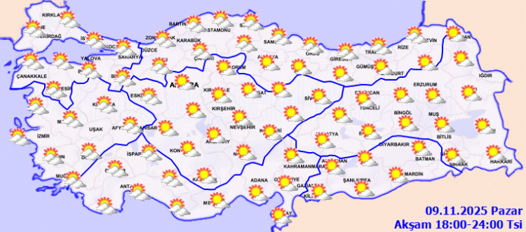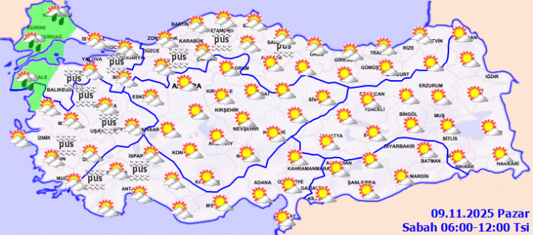 Yurdun geri kalan kesimlerinde havanın az bulutlu ve açık geçmesi beklenirken, sabah ve gece saatlerinde Marmara’nın güney ve doğusu, İç Ege, Batı Akdeniz’in iç kesimleri ile Batı ve Orta Karadeniz’in iç kesimlerinde pus ve yer yer sis etkili olacak.