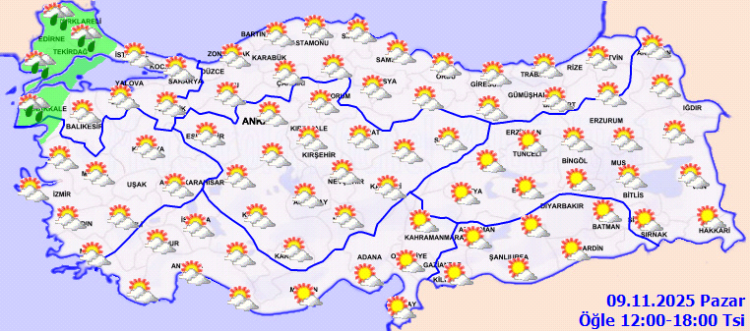 BURSA (İGFA) – Meteoroloji Genel Müdürlüğü (MGM), 9 Kasım Pazar gününe ilişkin hava tahmin raporunu yayımladı. Buna göre Marmara ve Ege’nin kuzeybatısında yer yer sağanak yağış beklendiğini duyurdu. Edirne, Kırklareli, Tekirdağ, Çanakkale çevreleri ile Balıkesir’in batı ilçelerinde aralıklı yağış öngörülüyor.