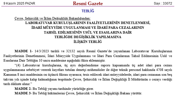 Resmi Gazete’nin bugünkü sayısında yayımlanan tebliğ değişikliğiyle, laboratuvar denetçilerinde idari para cezalarının 5 yıllık takibinde esas tarih, Çevre, Şehircilik ve İklim Değişikliği İl Müdürü’nün ceza verdiği gün olarak belirlenirken, belirsizlikler önlendi.