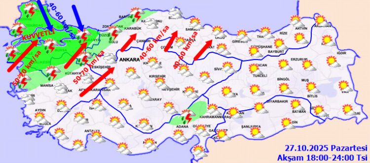 ANKARA (İGFA) – Meteoroloji Genel Müdürlüğü, 27 Ekim Pazartesi gününe ilişkin hava tahmin raporunu yayımladı.