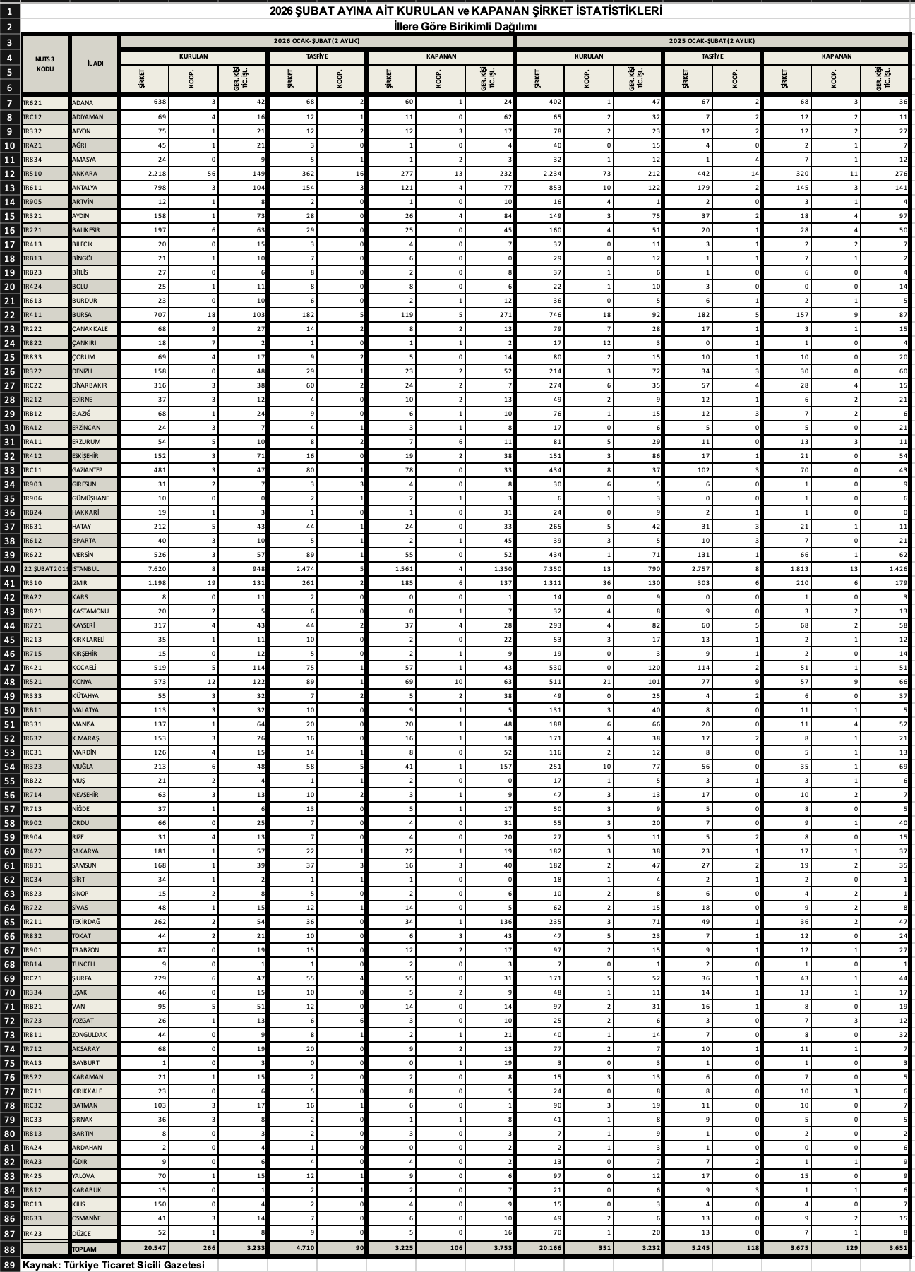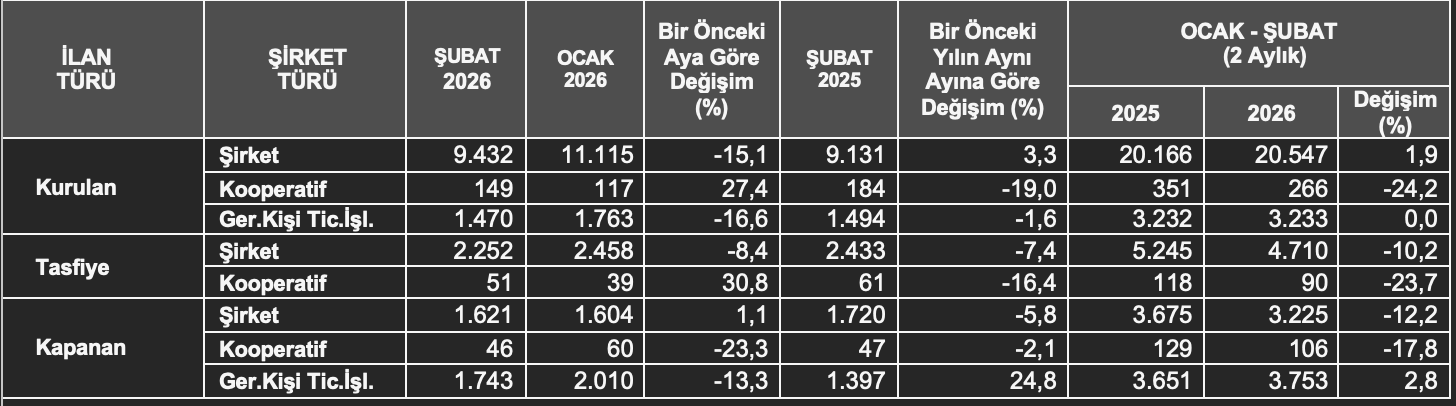 2026’nın ilk 2 ayında, 2025’in ilk 2 ayına göre; kapanan şirket sayısı %12,2 azaldı, kapanan kooperatif sayısı %17,8 azaldı, kapanan gerçek kişi ticari işletme sayısı %2,8 arttı.
