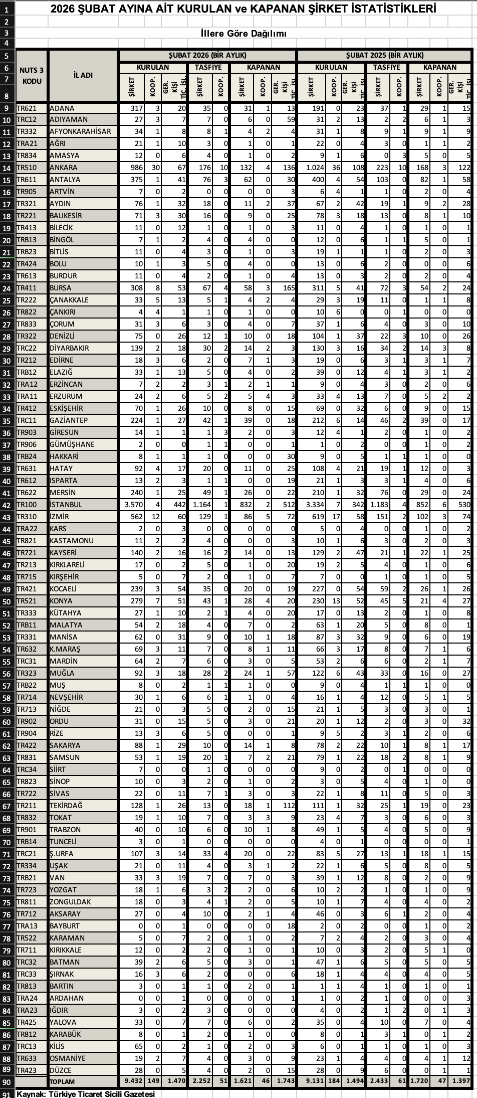 - Bir önceki aya göre; kapanan şirket sayısı %1,1 arttı, kapanan kooperatif sayısı %23,3 azaldı, kapanan gerçek kişi ticari işletme sayısı %13,3 azaldı.