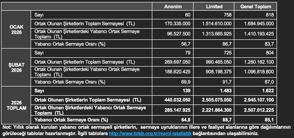 - Şubat 2026’da kurulan 804 yabancı ortak sermayeli şirketin 380’i Suriye, 123’ü Türkiye, 38’i İran ortaklı olarak kurulmuştur.