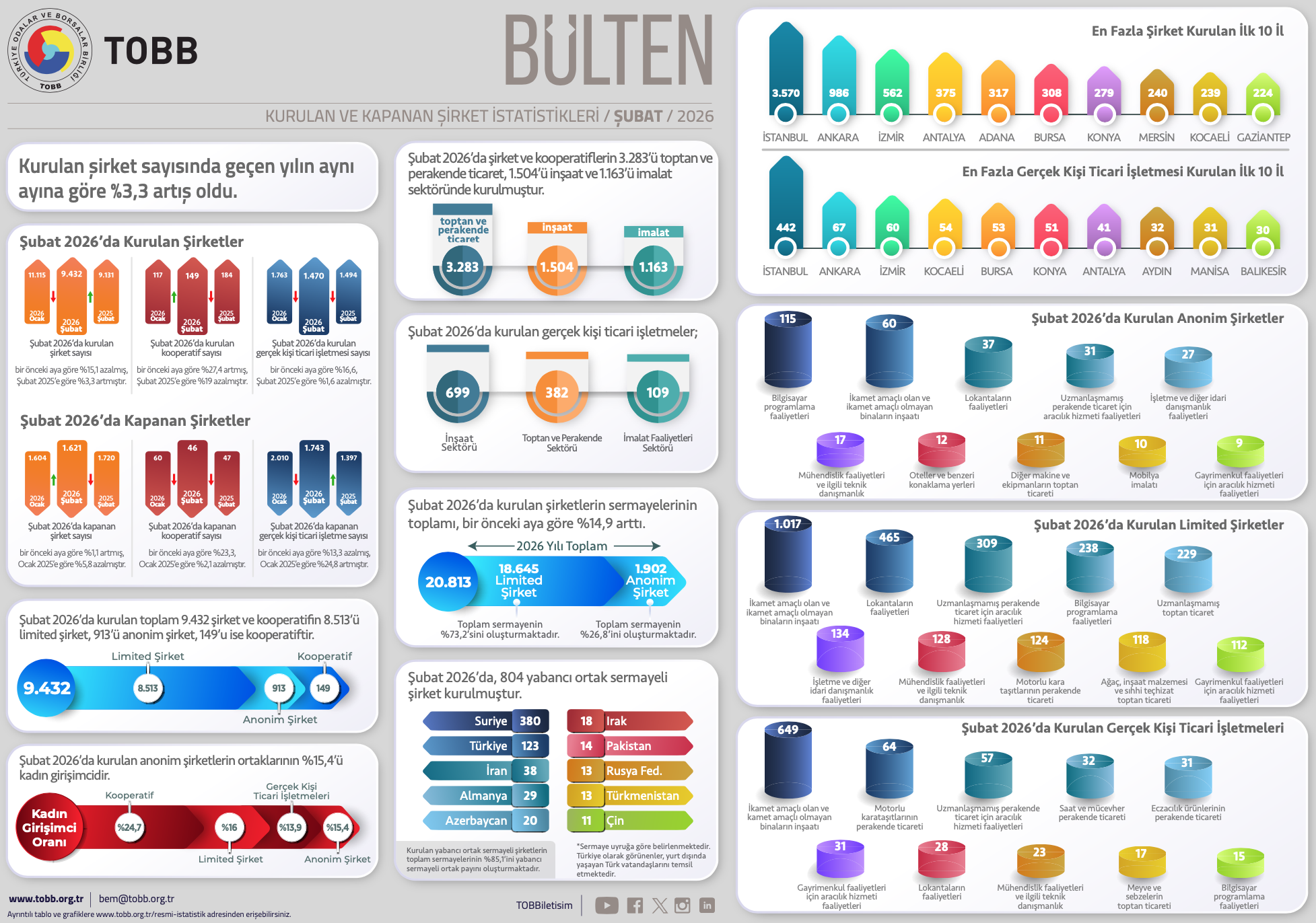 - Şubat 2026’da kurulan toplam 9.432 şirketin 913’ü anonim şirket, 8.513’ü ise limited şirkettir. Aynı ay içinde 149 kooperatif kurulmuştur. Şirketlerin %37,8’i İstanbul, %10,4’ü Ankara, %6,6’sı İzmir’de kurulmuştur.
