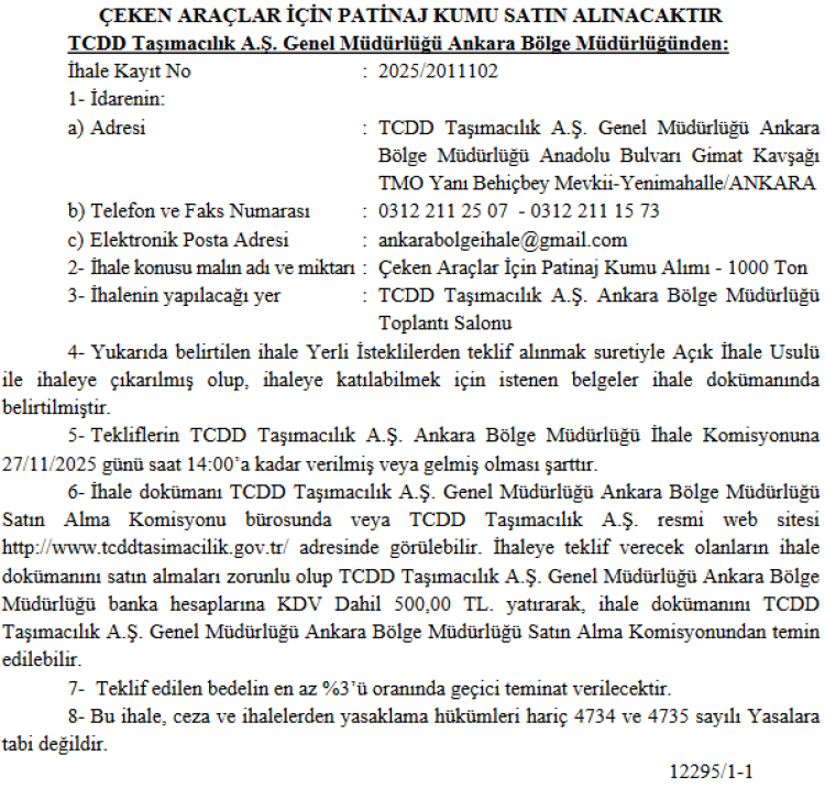 TCDD Taşımacılık A.Ş. Ankara Bölge Müdürlüğü, çeken araçlarda kullanılmak üzere 1000 ton patinaj kumu alımı için 27 Kasım 2025’te açık ihale düzenleyeceğini duyurdu.