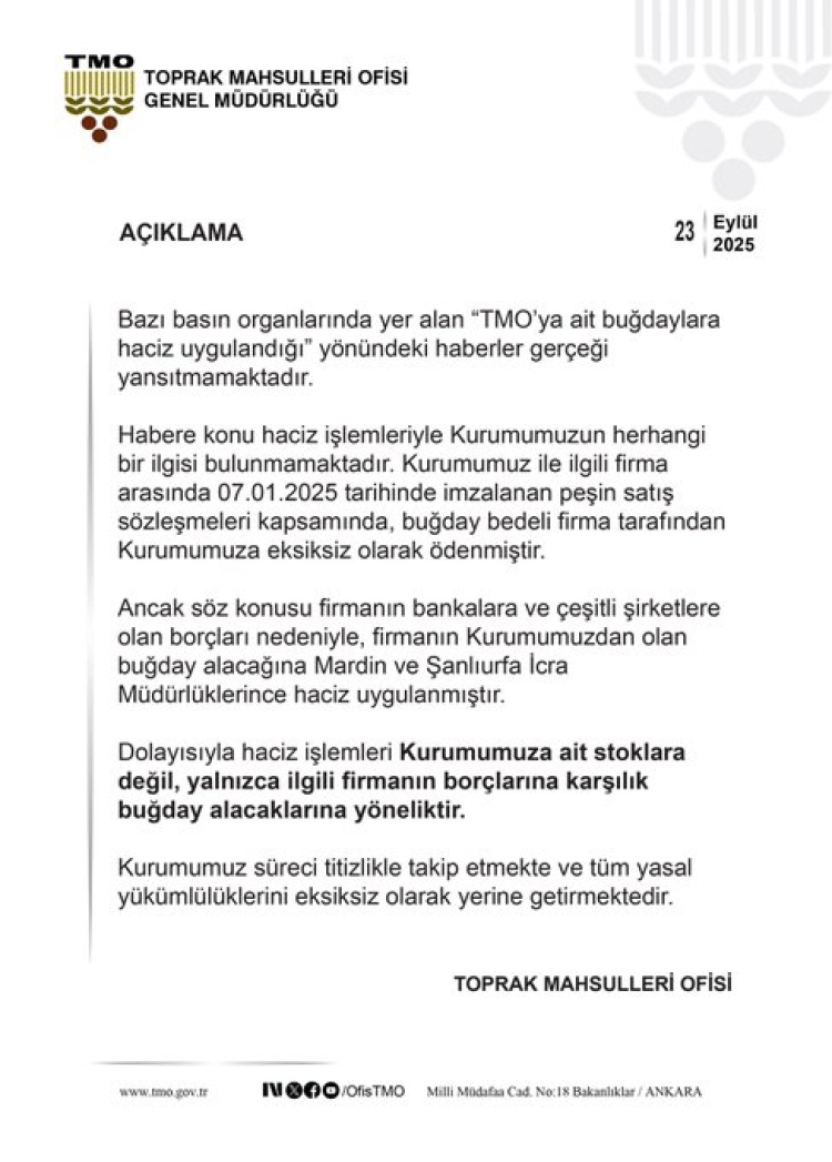 TMO, “Dolayısıyla haciz işlemleri Kurumumuza ait stoklara değil, yalnızca ilgili firmanın borçlarına karşılık buğday alacaklarına yöneliktir. Habere konu haciz işlemleriyle Kurumumuzun herhangi bir ilgisi bulunmamaktadır” diyerek kamuoyunu bilgilendirdi.