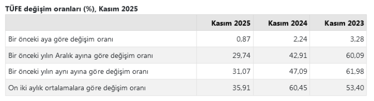 Buna göre TÜFE, Kasım’da bir önceki aya göre yüzde 0,87, bir önceki yılın aynı ayına göre ise yüzde 31,07 arttı. Yılbaşından bu yana artış oranı yüzde 29,74, on iki aylık ortalamalara göre artış ise yüzde 35,91 olarak gerçekleşti.