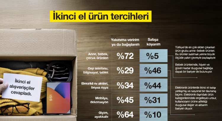 Araştırma, ikinci el alışverişin genç nesil tarafından online platformlardan, daha büyük yaş gruplarının ise geleneksel kanallardan tercih edildiğini gösteriyor. Ayrıca güven, ikinci el alışverişte belirleyici unsur: Katılımcıların yüzde 83’ü satıcı güven verirse, yüzde 82’si ürün arızalı değilse veya garanti/iade varsa alışveriş yaptığını belirtti.