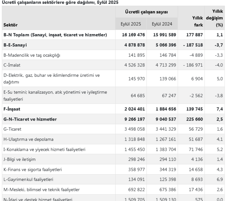 TÜİK’in açıkladığı Eylül 2025 istatistiklerine göre, sanayi, inşaat ve hizmet (ticaret-hizmet) sektörlerindeki ücretli çalışan sayısı yıllık bazda yüzde 1,1’lik artışla 16 milyon 170 bine yükseldi. Yıllık bazda inşaat sektörü güçlü bir artış gösterirken, bu sektörü ticaret ve hizmette gayrimenkul hizmetleri ile konaklama-yiyecek faaliyetleri takip etti.