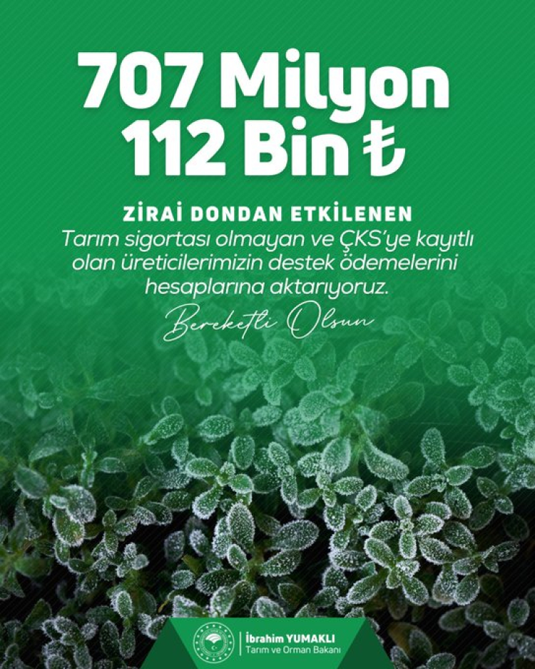 ANKARA (İGFA) – Tarım ve Orman Bakanı İbrahim Yumaklı, zirai dondan zarar gören üreticilere yapılan destek ödemelerine ilişkin yeni bir açıklama yaptı.
